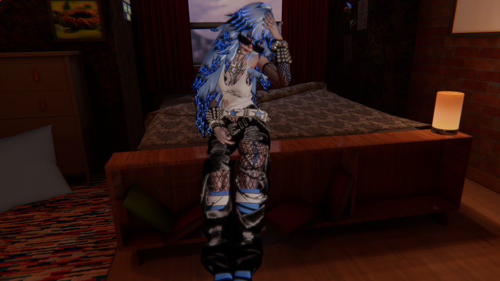 This is my second avatar in my upcoming collection based off Billy Idol's album Rebel Yell! This avatar is inspired by the song Blue Highway, and similar to how most of my avatars will proceed to look, there's a heavy rock and roll theme seen here, alongside the 80's and a general biker-type that I did my best to encapsulate. I'm in love with how she turned out and I hope you are as well!
