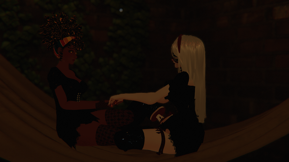 Camilla, the angel, is blind, due to her eyes being gouged out in a battle, of the ongoing war between Heaven and Hell. Carolina saw this, and took her away from the battlefront to their camp, hiding her away so no one could see her. Camilla did not know that this was not her own camp, and thought that Carolina was one of her own kind. Carolina soon took over the role of protecting Camilla, and once they were back home from their deployment, Camilla was no longer an Angel, having committed sinful things (wink wink nudge nudge) with Carolina, and venturing into Hell, instead of Heaven. Camilla soon found out about the fact that Carolina was not an Angel, but got over it eventually, due to her overflowing love for Carolina. They eventually got married, & lived on in Hell, happy as can be.